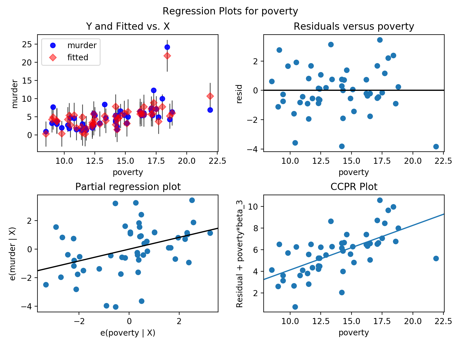 This plots four graphs in a 2 by 2 figure: ‘endog versus exog’, ‘residuals versus exog’, ‘fitted versus exog’ and ‘fitted plus residual versus exog’