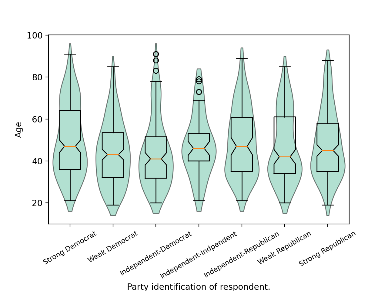 >>> plt.rcParams['figure.subplot.bottom'] = 0.23 # keep labels visible >>> age = [data.exog['age'][data.endog == id] for id in party_ID] >>> fig = plt.figure() >>> ax = fig.add_subplot(111) >>> sm.graphics.violinplot(age, ax=ax, labels=labels, ... plot_opts={'cutoff_val':5, 'cutoff_type':'abs', ... 'label_fontsize':'small', ... 'label_rotation':30}) >>> ax.set_xlabel("Party identification of respondent.") >>> ax.set_ylabel("Age") >>> plt.show()