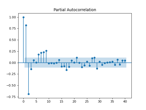 statsmodels.graphics.tsaplots.plot_pacf(x, ax=None, lags=None, alpha=0.05, method='ywadjusted', use_vlines=True, title='Partial Autocorrelation', zero=True, vlines_kwargs=None, **kwargs)[source]¶ Plot the partial autocorrelation function