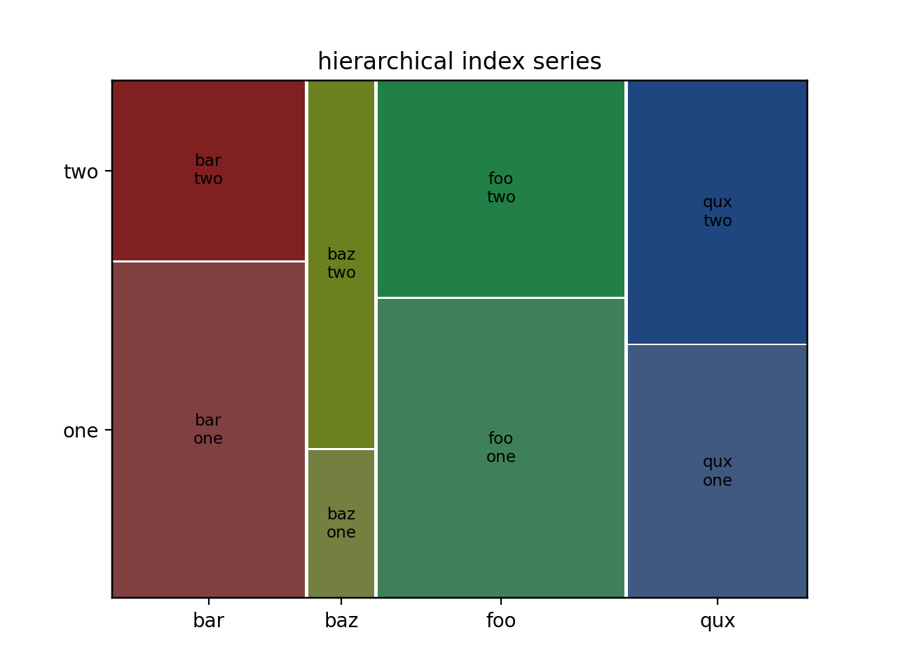 >>> rand = np.random.random >>> from itertools import product >>> tuples = list(product(['bar', 'baz', 'foo', 'qux'], ['one', 'two'])) >>> index = pd.MultiIndex.from_tuples(tuples, names=['first', 'second']) >>> data = pd.Series(rand(8), index=index) >>> mosaic(data, title='hierarchical index series') >>> plt.show()The third accepted data structure is the np array, for which a very simple index will be created.