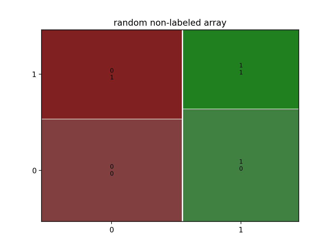 >>> rand = np.random.random >>> data = 1+rand((2,2)) >>> mosaic(data, title='random non-labeled array') >>> plt.show()If you need to modify the labeling and the coloring you can give a function tocreate the labels and one with the graphical properties starting from the key tuple