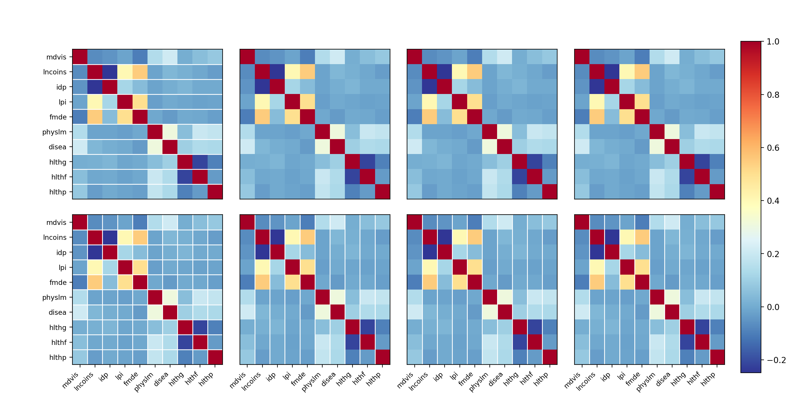 >>> import numpy as np >>> import matplotlib.pyplot as plt >>> import statsmodels.api as smIn this example we just reuse the same correlation matrix several times. Of course in reality one would show a different correlation (measuring a another type of correlation, for example Pearson (linear) and Spearman, Kendall (nonlinear) correlations) for the same variables.