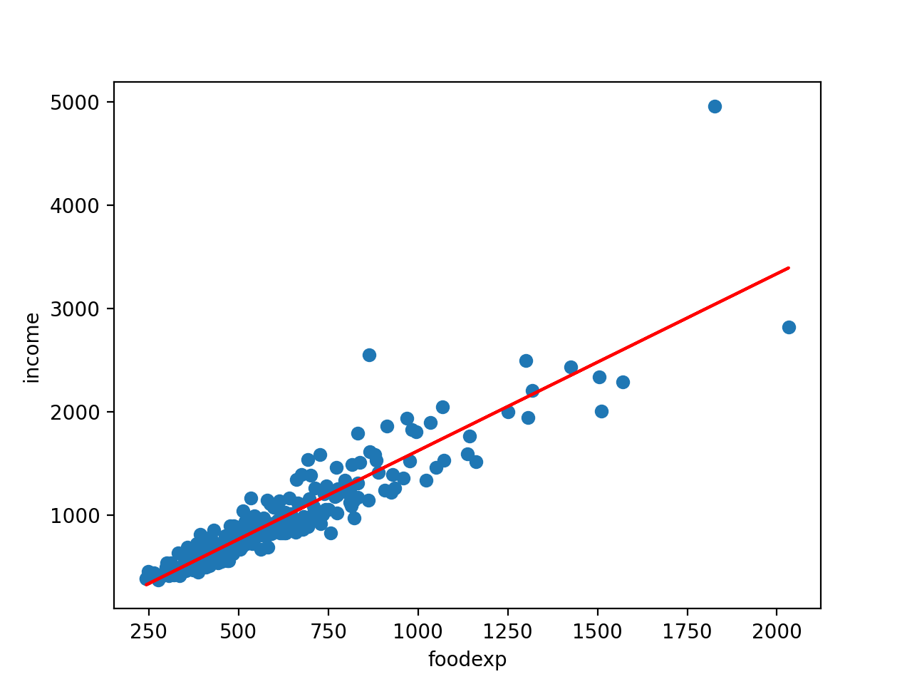 >>> import statsmodels.api as sm >>> import numpy as np >>> import matplotlib.pyplot as plt >>> from statsmodels.graphics.gofplots import qqline>>> foodexp = sm.datasets.engel.load() >>> x = foodexp.exog >>> y = foodexp.endog >>> ax = plt.subplot(111) >>> plt.scatter(x, y) >>> ax.set_xlabel(foodexp.exog_name[0]) >>> ax.set_ylabel(foodexp.endog_name) >>> qqline(ax, "r", x, y) >>> plt.show()(