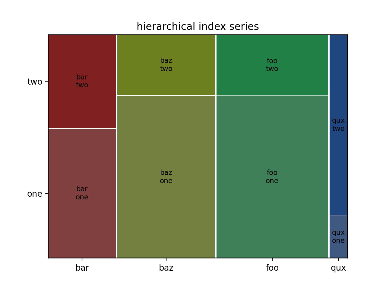 >>> rand = np.random.random >>> from itertools import product >>> tuples = list(product(['bar', 'baz', 'foo', 'qux'], ['one', 'two'])) >>> index = pd.MultiIndex.from_tuples(tuples, names=['first', 'second']) >>> data = pd.Series(rand(8), index=index) >>> mosaic(data, title='hierarchical index series') >>> plt.show()The third accepted data structure is the np array, for which a very simple index will be created.