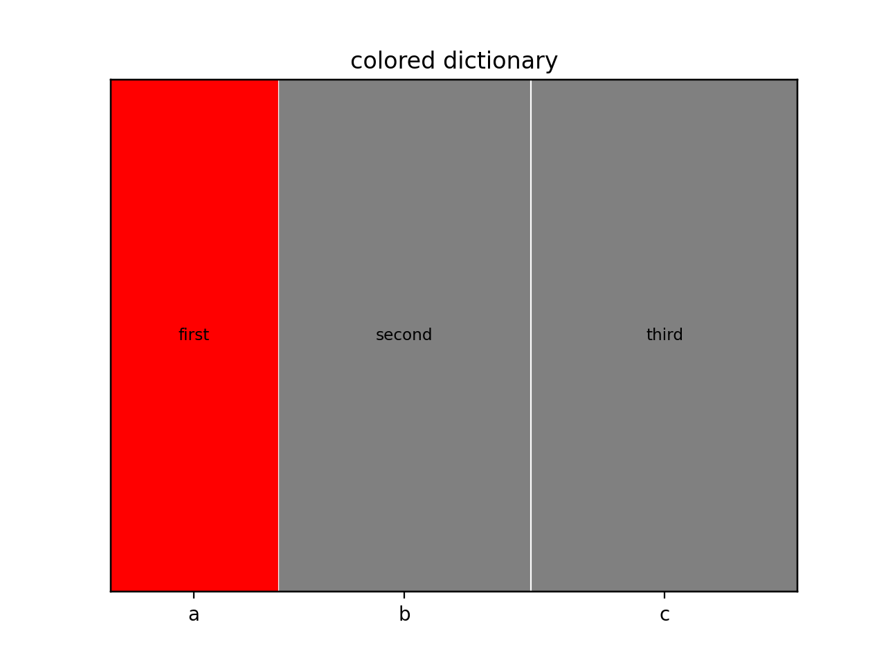 >>> data = {'a': 10, 'b': 15, 'c': 16} >>> props = lambda key: {'color': 'r' if 'a' in key else 'gray'} >>> labelizer = lambda k: {('a',): 'first', ('b',): 'second', ... ('c',): 'third'}[k] >>> mosaic(data, title='colored dictionary', properties=props, ... labelizer=labelizer) >>> plt.show()Using a DataFrame as source, specifying the name of the columns of interest