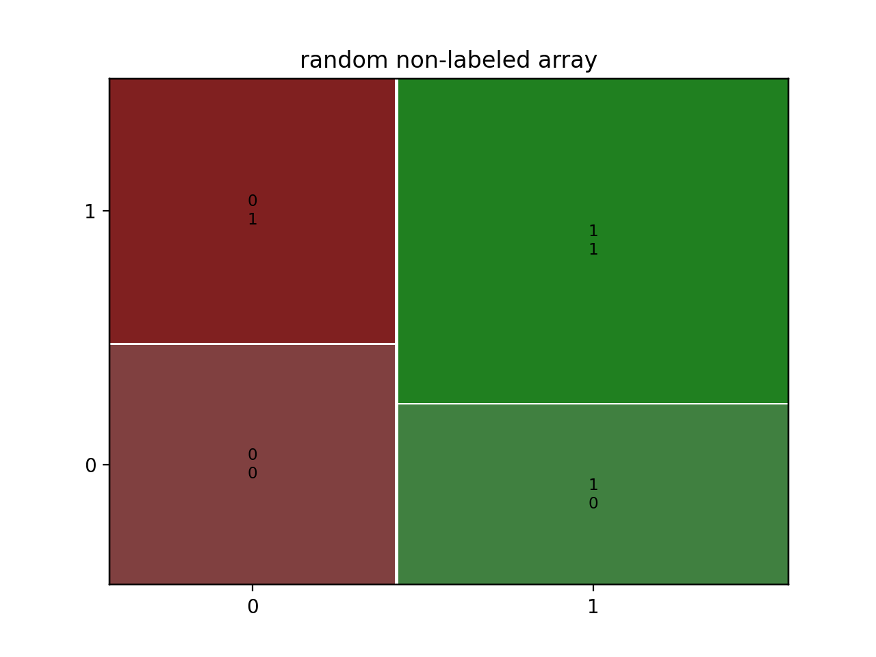 >>> rand = np.random.random >>> data = 1+rand((2,2)) >>> mosaic(data, title='random non-labeled array') >>> plt.show()If you need to modify the labeling and the coloring you can give a function tocreate the labels and one with the graphical properties starting from the key tuple