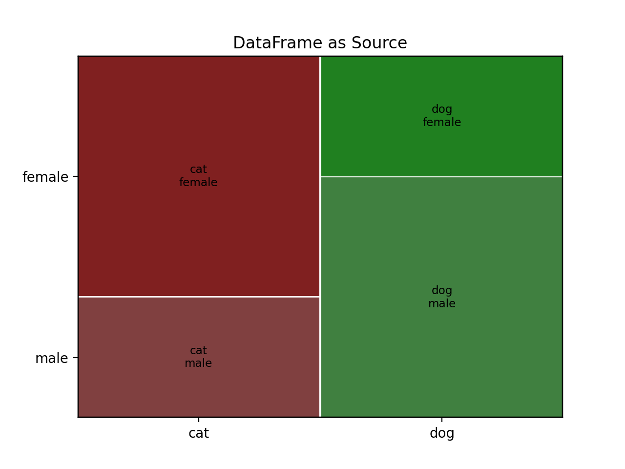 >>> gender = ['male', 'male', 'male', 'female', 'female', 'female'] >>> pet = ['cat', 'dog', 'dog', 'cat', 'dog', 'cat'] >>> data = pd.DataFrame({'gender': gender, 'pet': pet}) >>> mosaic(data, ['pet', 'gender'], title='DataFrame as Source') >>> plt.show()(