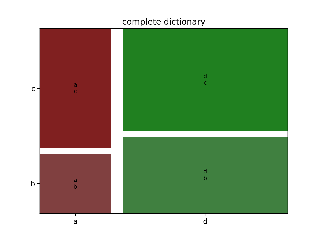 >>> data = {('a', 'b'): 1, ('a', 'c'): 2, ('d', 'b'): 3, ('d', 'c'): 4} >>> mosaic(data, gap=0.05, title='complete dictionary') >>> plt.show()The same data can be given as a simple or hierarchical indexed Series