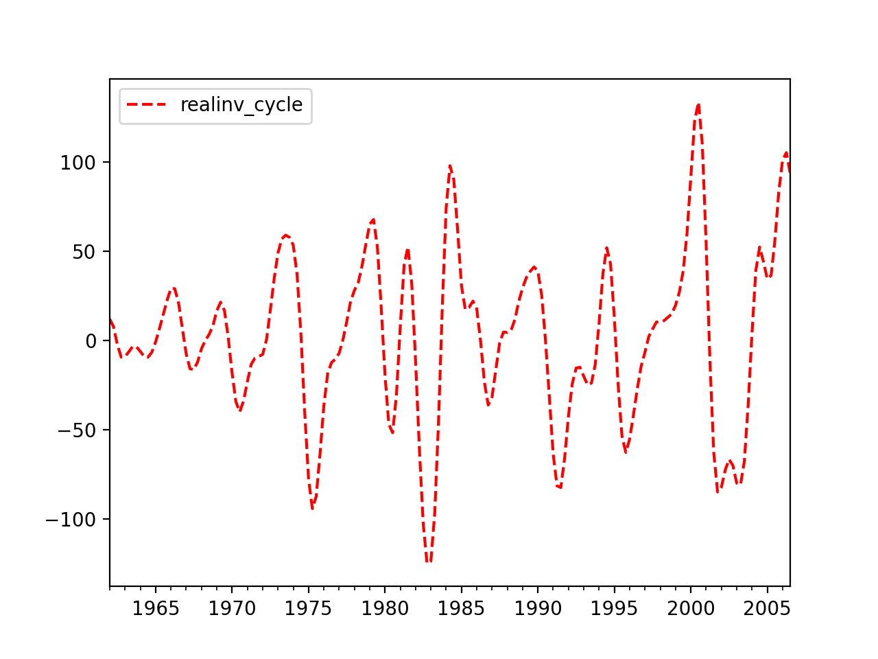 >>> import statsmodels.api as sm >>> import pandas as pd >>> dta = sm.datasets.macrodata.load_pandas().data >>> index = pd.DatetimeIndex(start='1959Q1', end='2009Q4', freq='Q') >>> dta.set_index(index, inplace=True)>>> cycles = sm.tsa.filters.bkfilter(dta[['realinv']], 6, 24, 12)>>> import matplotlib.pyplot as plt >>> fig, ax = plt.subplots() >>> cycles.plot(ax=ax, style=['r--', 'b-']) >>> plt.show()(